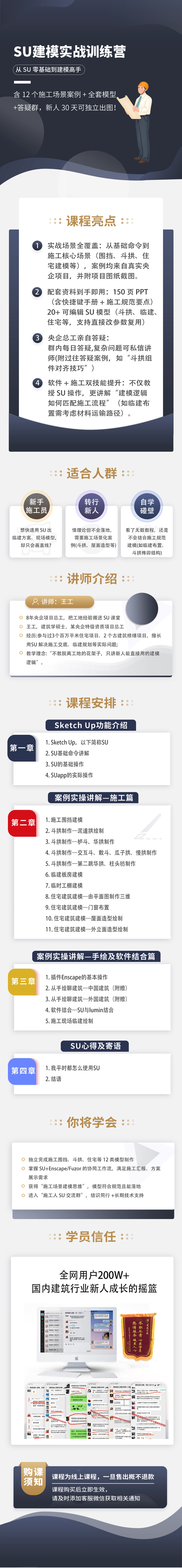 建筑学硕士,某央企特级资质项目总工,8年央企项目总工,把工地经验搬进SU课堂,参与过3个百万平米住宅项目、2个古建筑修缮项目,擅长用SU解决施工交底、临建规划等实际问题;,教学理念:“不教脱离工地的花架子,只讲新人能直接用的建模逻辑”