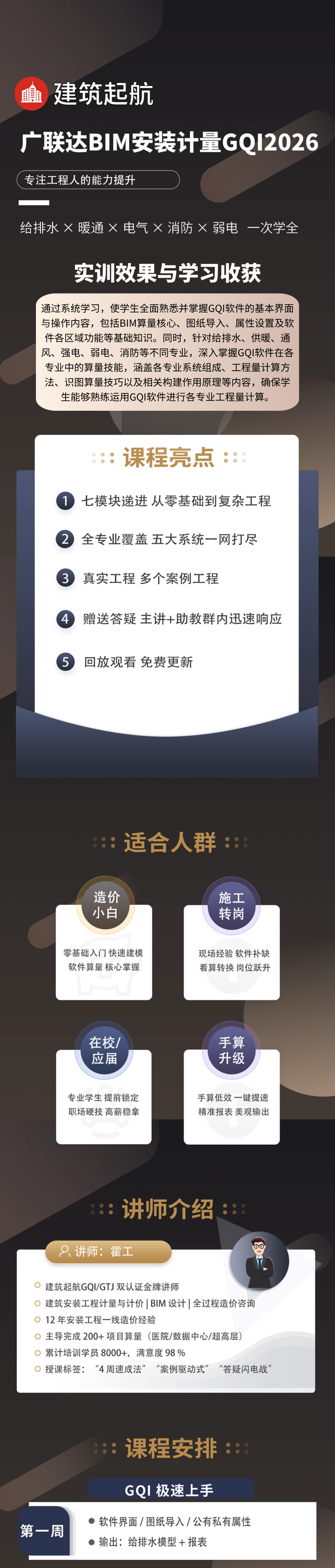 建筑起航GQI/GTJ双认证金牌讲师 建筑安装工程计量与计价 | BIM设计 | 全过程造价咨询 12年安装工程一线造价经验 主导完成200+项目算量 授课标签:“4周速成法”“案例驱动式”“答疑闪电战”